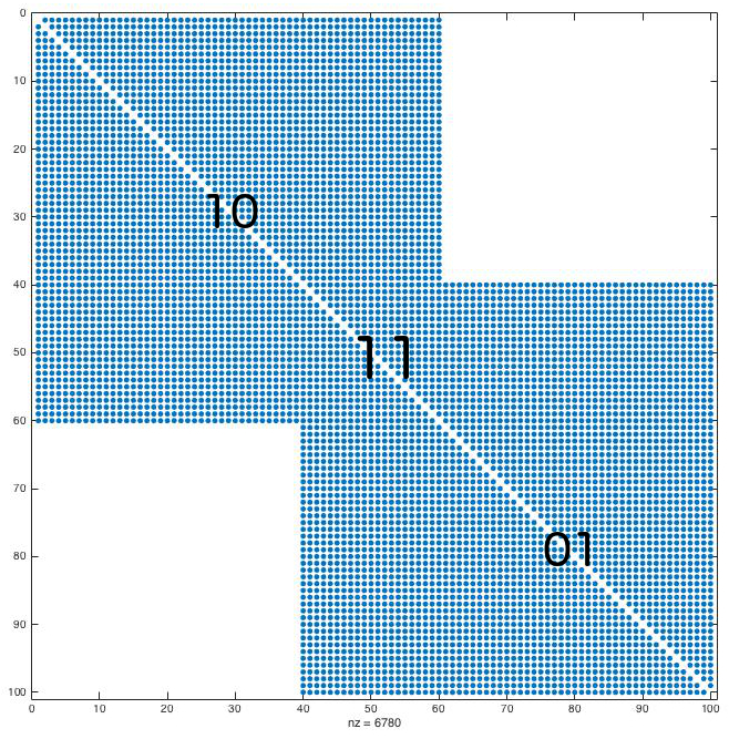 , but we are not given the binary vertex features. How do we learn (a good setting of) the binary features? This is a fundamental learning problem on networks with many related applications. This set of applications includes overlapping community detection: think that features correspond to communities as in the following figure. What we see are two overlapping communities. Vertices that belong to both communities are labeled as 11, whereas the rest are labeled as 10 or 01.