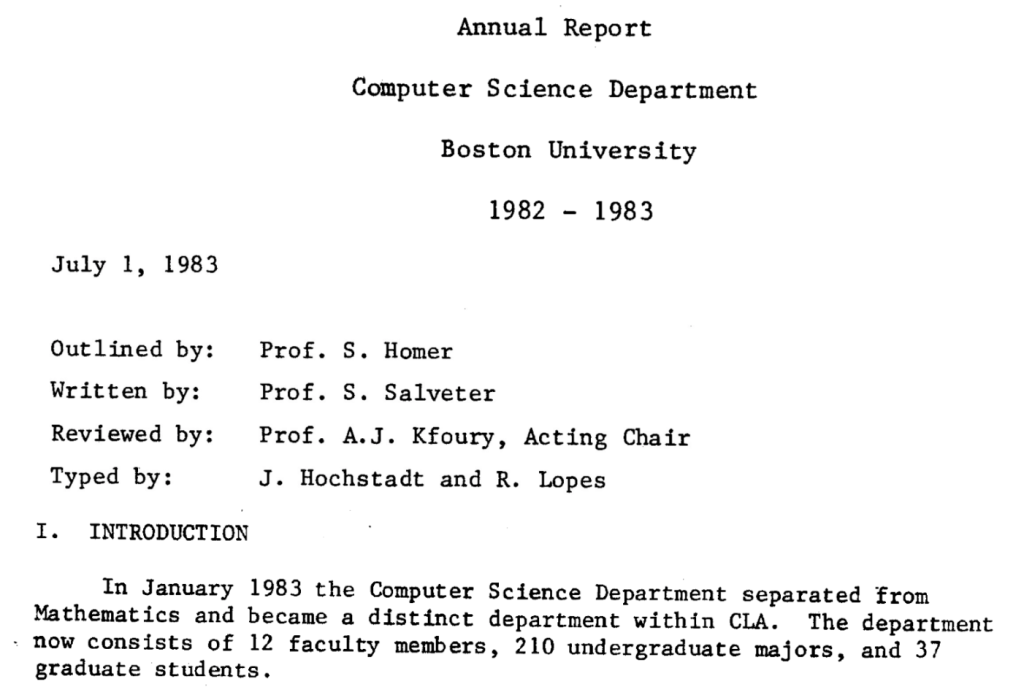 Today, we are commemorating the 40th anniversary of the Computer Science department at Boston University and I had the honor to represent the data group as the speaker. Here’s a historical snapshot from the inaugural annual report (thanks to the department chair Abraham Matta), indicating the establishment of the Computer Science department. Steve Homer and Assaf Kfoury are still active professors in the department.