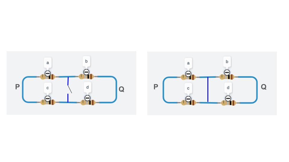 to 0. This is also called short-circuiting. By Rayleigh’s monotonicity principle, the effective resistance between P,Q of the left circuit is larger than the corresponding effective resistance of the right circuit. By using the standard in-series and in-parallel equivalent resistors, we obtain that the effective resistance between P,Q for the left circuit is